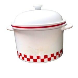 The sleek white design and red checkered print is perfect for any setting. Safe for oven and microwave use, but not safe for stove top use.