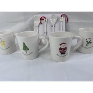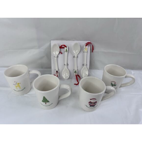 BIA Happy Holidays Set of 4 Christmas Mugs & Matching Ceramic Spoons Cordon Bleu