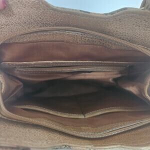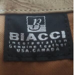 Beautiful soft textured leather bag with lots of compartments inside and out. The lining says "BIACCI" as well. Brushed goldtone hardware. Measures 9-10" W x 10"H(no straps) x 4" D x 10" strap drop.