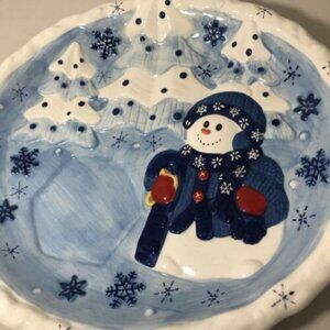 BICO China 15" Blue Snowman snowflakes Serving Platter Tray.