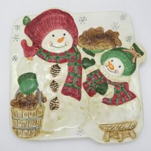 This ceramic trivet is by BICO. Featuring two smiling snowmen with cozy knit hats, red and green plaid scarves, and baskets of gingerbread cookies, this festive piece is both functional and decorative. Perfect for protecting countertops from hot dishes, displaying holiday treats, or using as part of a Christmas vignette.
