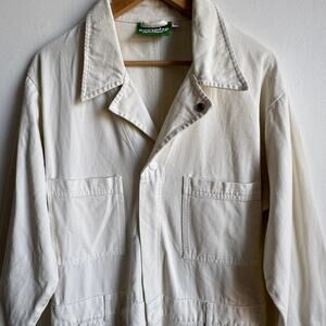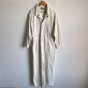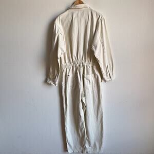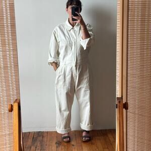 Details: Big Bud Press Everyday Jumpsuit in Vintage Tee Off-White; a long sleeve jumpsuit silhouette with partial zip front closure with two snap buttons at chest/neckline, long sleeves with button cuffs, crop to full length straight leg (see inseam measurement below), two chest pockets, two hip pockets, and two back pockets.