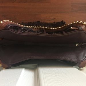 BIG BUDDHA PURSE BURGUNDY LEATHER FULL FRINGE WITH GOLD BEEDING ALL AROUND STRAPS ZIPPER OUTSIDE POCKET VERY ROOMY INSIDE NEW WITHOUT TAGS 12 1/2"WIDE 121/2"LONG BOHO STYLE