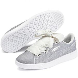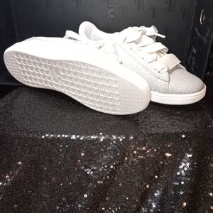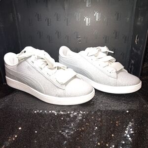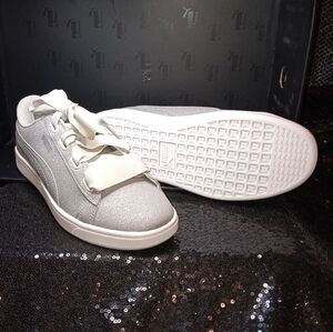 BIG KID SILVER AND WHITE GLITTER PUMA SNEAKERS WITH RIBBON STRINGS SIZE 7 WHICH IS A WOMENS 8.5 BRAND NEW WITH BOX .VERY PRETTY DRESS UP OR DOWN.