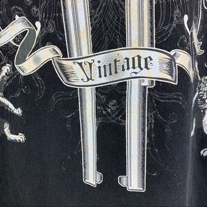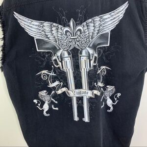 The Vintage graphic of this black Biker Wear sleeveless button-down is detailed and will definitely reflect your feelings about guns. The shirt is in great shape, with distressed fringed armholes. A little curling of hem as shown. Could be ironed out if you wanted a more finished look. Please see photos for additional details.