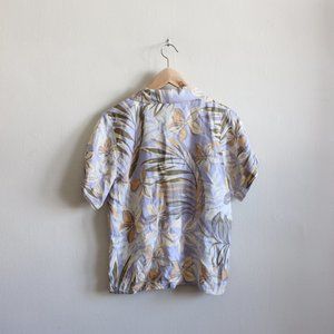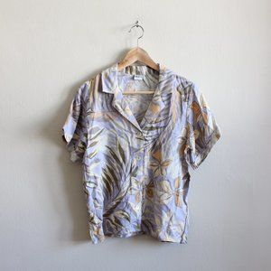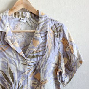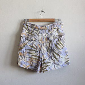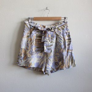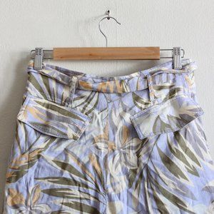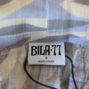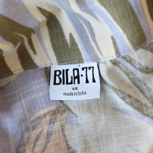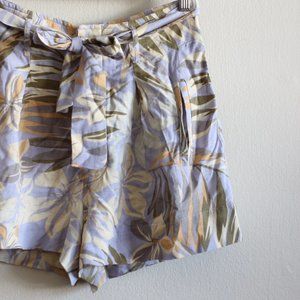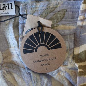 BILA 77 2 piece coordinating set in pastel periwinkle blue, green and tan Da Mist print 100% rayon. "Campo" style top in size EXTRA SMALL has notched collar, shell buttons down the front, and short sleeves. "San Marcos" style shorts in size SMALL have high rise, button fly, belt loops and matching tie belt, and front and back pockets.