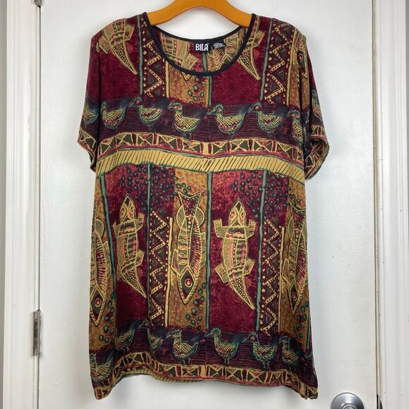 BILA Vintage 90s VTG Women’s Earthtone Ethnic Tribal Gauzy Tunic Top Animal sz S