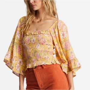 BILLABONG Be My Babe Crop Top Sz L Yellow Floral Bell Sleeve Square Neck Viscose