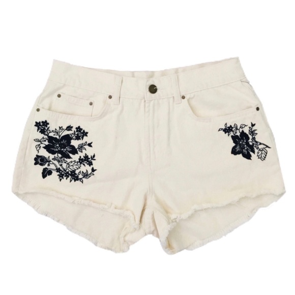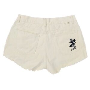 A little sweet and a little savage, this distressed denim short is topped with floral embroidery at the front and back. The off-white denim short features a 5-pocket design with a raw hem and mid-rise cut.