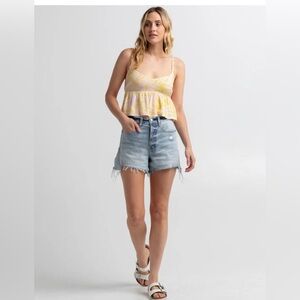 Billabong Hey There Cropped Cami Top. The Hey There cropped cami top is here and happy to meet you. Saturated in sunny hues and paradise palms, this women's cami top from our Sweet Tropics Collection features a bold tropical print on crinkle fabric. The peplum waist ruffle keeps it lightweight and flowy, while the V-neckline and sweets shoulder ties add to its laid-back vibe. Crinkle Viscose. Cropped fit. V Neckline. Peplum ruffle at waist. Self tie straps at shoulder. Billabong metal plate detail. 100% Viscose. Hand wash. Imported