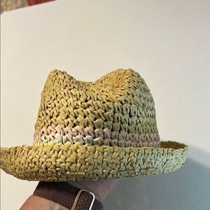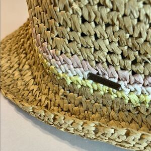 One size fits most paper / straw cowboy / sun hat. Stylish straw hat by Billabong with pastel pink, white, and yellow accents. Ribbon detail on inside for comfort. Very easy to manipulate, great for traveling. Brim can be rolled up or left down.