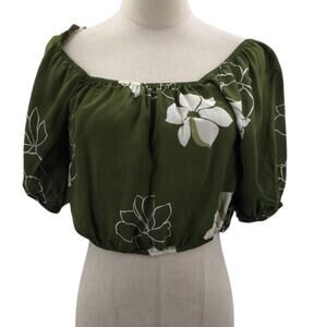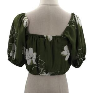 BILLABONG SZ M olive green tropical floral puff sleeve crop top blouse B122
