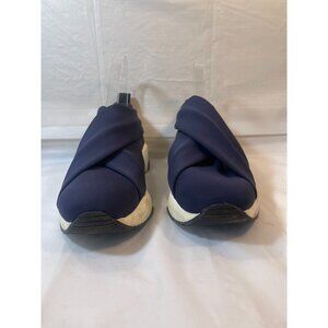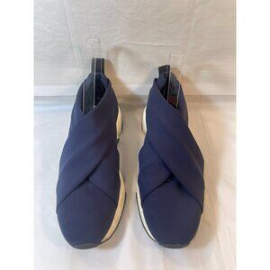 Blue slip-on sneaker in stretchy lycra with decorative criss-cross panels across the front that fasten behind the heel. The shoe has a white sporty rubber sole with black details, which provides contrast to the white sole.