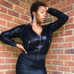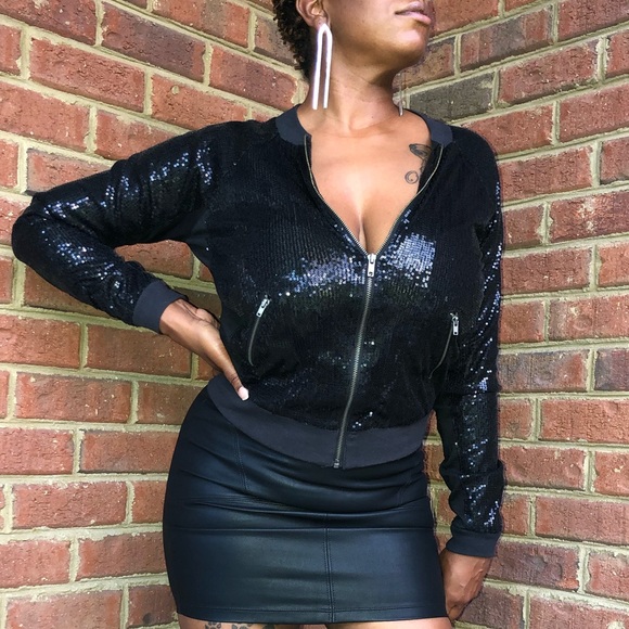 Glimmer and shimmer away! This cute mini bomber will add some pizazz to any fit. Zips in the front. Model is 34 DDD, 5’5”.