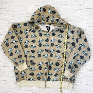 Vintage Billionaire Boys Club BBC Sweatshirt hoodie with all-over diamonds and dollar sign print in aqua and black on a beige/tan base. Midweight loopback fleece interior. Very good pre-owned condition with small bleach mark on front and mark on the cuff (see photos).