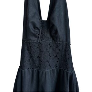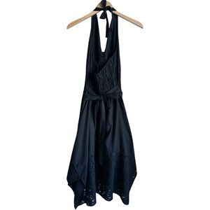 BILLY REID Black Floral Eyelet Halter Midi Dress | Handkerchief Skirt Tie Neck M