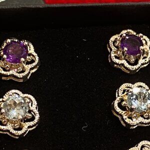 BIN 3 prs SILVER-tone AMETHYST Clear RUBY CZ Flower STUDS * Giftable * Thick