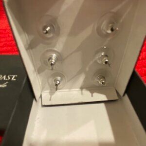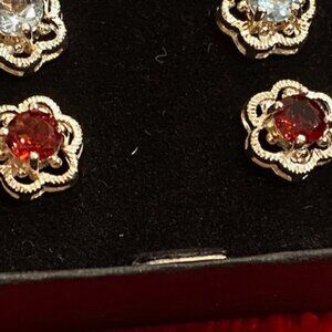 GOLD COAST * brand new and still in gift box ~ 3 pairs of silver-tone (don't know if they're silver-filled or plated) STUDS ~ scalloped FLOWER edges (double thickness) with AMETHYST (purple ~ February birthstone) ~ CLEAR "Diamond" (April birthstone) ~ RUBY or GARNET (red ~ July or January birthstone) large CZ in the center. They have clear plastic hypoallergenic backings. I put a dime next to them, so you could get an approximate size. If you're allergic to certain metals, just coat the posts and back of the studs with clear nail polish. These are big enough to wear on their own, but also perfect if you have multiple piercings.