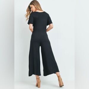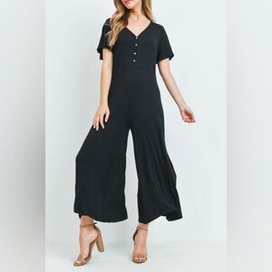 • Short Sleeved V-neck button front wide legged jumpsuit.