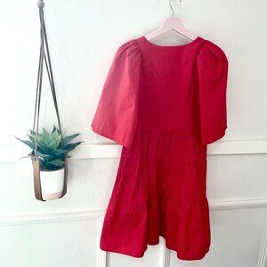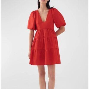 This is a gently used BIRD & KNOLL Gigi Puff-Sleeve Tiered Poplin Mini Dress Red Size S. In excellent condition. Minimal wear. See all pics for condition.