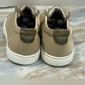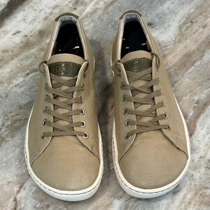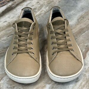 Birkenstock Aaron tan canvas lace up sneakers- size 39. Great, used condition. Little sign of wear on canvas and footbeds, overall very clean and good condition. See all photos. Smoke free home. Fast shipping!