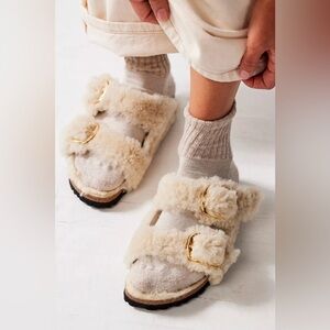 Features: Slip-on style, backless design, contoured cork-latex footbed, plush, teddy shearling upper, teddy shearling footbed lining, EVA sole, two adjustable straps with oversized metal pin buckles