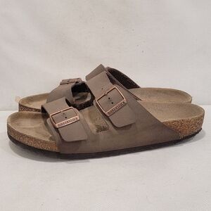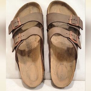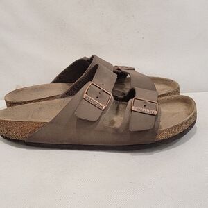 Birkenstock brown leather slide style sandals (sz - EU 43 or US - L 12 or M - 10 - 10-1/2. The sandals have a little wear on the bottom but they are in good condition. Please see all pictures.