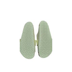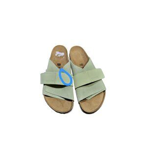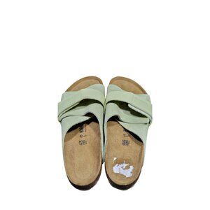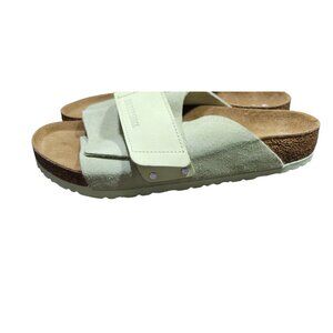 The BIRKENSTOCK Kyoto Nubuck-Suede Slide Sandal in men's size US 11 is a stylish and comfortable choice for casual occasions. Made with high-quality nubuck suede and featuring a slip-on closure, this sandal offers a secure fit and easy wear. The rubber outsole provides durability and traction, while the leather lining and cork insole ensure a comfortable and breathable experience. Designed for summer, fall, and spring, these sandals are a versatile addition to any man's wardrobe, crafted by the renowned brand Birkenstock in Germany.This item is unboxed and unlabeled. It comes from a discount store. The color is mint.It has two small spots. Please look at the photos with a blue circle.