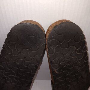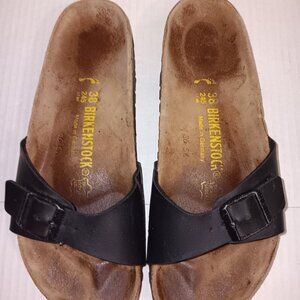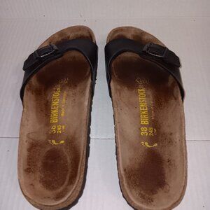 Size 38 (Ladies 7)(Men's 5) - Birkenstock Madrid slide sandals has a single buckle strap and a contoured cork footbed in the colors black and tan in preowned condition. NOTE signs of wear PLEASE SEE all photos and video for wear and condition