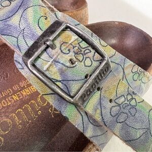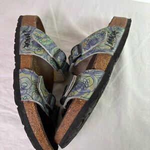Gorgeous, rare, and extremely hard-to-find Birkenstock Papillion Arizona sandals with Jerry Garcia's art. Lovely colorway of swirling green, blue, purple, tan abstracts, and black line art featuring a loose floral design. "J. Garcia" signature on outer sides.