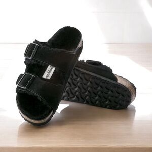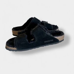 Perfect sandals for chilly winter or fall evenings This Birkenstock Arizona is a classic model with two adjustable straps. The Upper is genuine high quality Suede. It has a shaped Cork/Latex footbed with a black shearling lining. Lightweight EVA sole. The straps have individual adjustable metal buckles. Popular unisex Birkenstock Ladies 8 Men 6