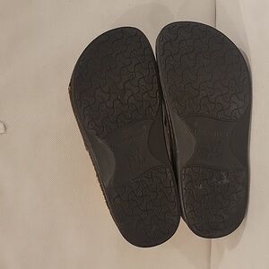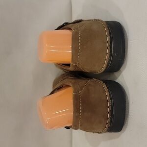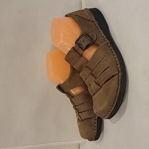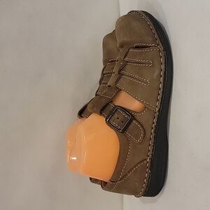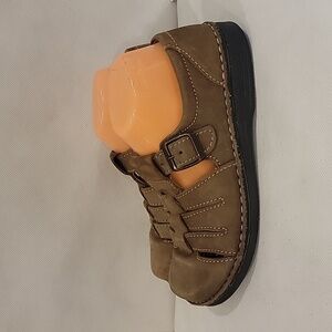 Birkenstocks light brown nubuck leather shoes. There is a buckle on the outer ankle. (sz W 9 M7). The shoes are in very good condition. Please see all pictures.