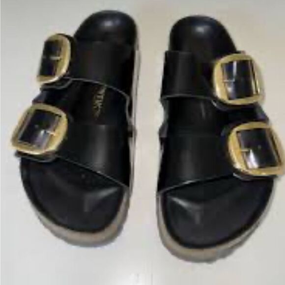 These big buckle, black leather sandals have been lightly worn, and show signs of wear. See pictures