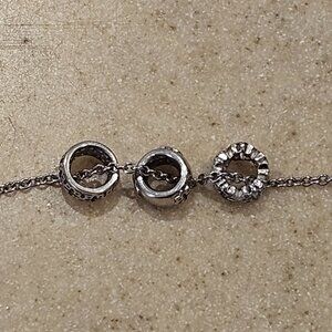 This is a RARE BIRKS MAYORS 925 STERLING SILVER MUSE 3 RING NECKLACE. This is from the Muse Dare to Dream collection. This trio of sterling silver ring pendants are a single element in a variety of textures. An adjustable chain that can be worn at full length (18) or set to the perfect position with the shortening rings (16 or 17). A solid band sits at the center at 4.3 mm wide. One is 4.6 mm wide with open edges and a close-up detail. The other is 4.0 mm wide with smooth closed edges. It was purchased MANY YEARS ago from Mayor's jewelry. Mayor's Jewelry is a fine jewelry store and owned by Birk's Jewelry, which is the Tiffany's of Canada. It is marked, "BIRKS 925." 925 is the mark for sterling silver. CLASSIC addition to any collection or a WONDERFUL gift!! This is pre-owned. Pictures of actual item.
