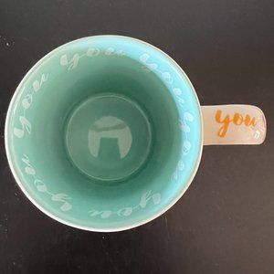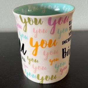 This colorful ceramic mug features the word 'You' repeated over and over on the exterior surface, the handle, and around the inside rim. One side reads, "This Mug has You Written All Over It" with "This is an Extremely Totally Unique Very Expensive Incredibly Thoughtful Birthday Gift" on the other side.