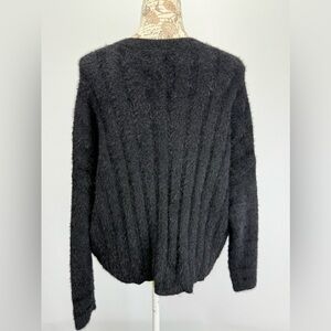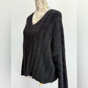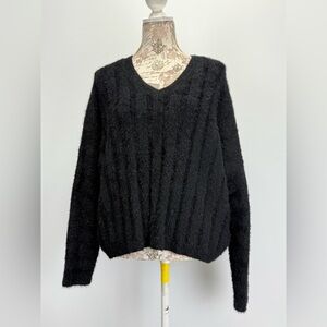 This black V-neck sweater from Bishop + Young, size M, features a classic ribbed texture that adds a touch of elegance to its relaxed fit. Made from a soft knit material, it offers both comfort and style, making it a versatile addition to any wardrobe.