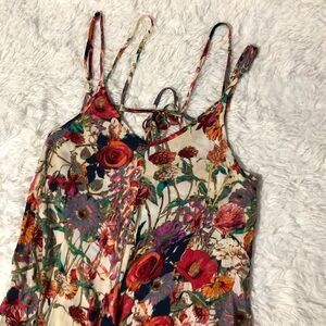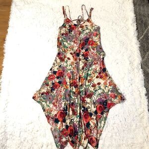 Floral print dress / waterfall cut / flowy / handkerchief style hemline/ spaghetti straps/ v neck/ exposed back w/ tie