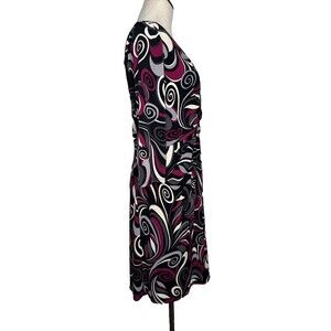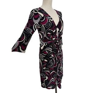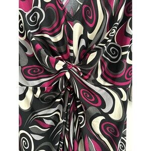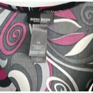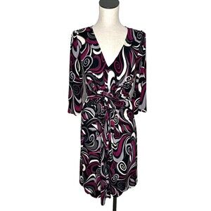 BISOU BISOU WOMENS MIDI STRETCH DRESS Size: 14 Color: Black, Gray, Purplish/Pink, Cream, Printed Condition: Very Good Features: Low V-Neck, Midi, Sheath, Geometric Swirl Pattern, Twist Knot Front, Stretch, 3/4 Sleeves Material: 95% Polyester, 5% Spandex Measurements are approximate: