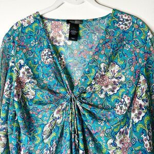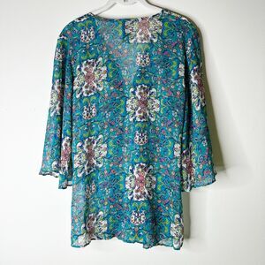 BISOU BISOU Top Women M Teal Blue Floral Sheer Flowy Babydoll V-neck Blouse NWOT