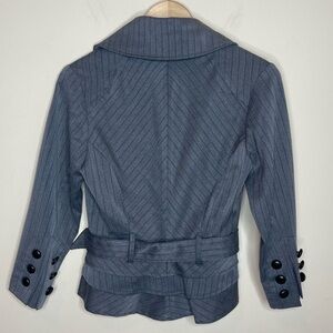 bisou bisou michele bohbot 3/4 sleeve gray striped suit belted jacket. adjustable belt. underarm to underarm approx 16.5. very cute jacket. good condition, no holes or stains.