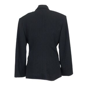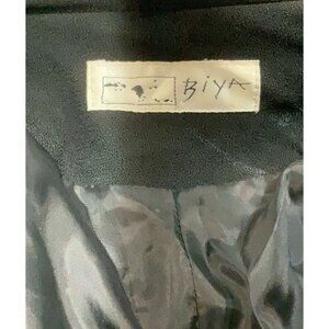 The BIYA Johnny Was Black Textured Blazer Jacket in size M is a vintage piece with a solid pattern and button closure. This mid-length jacket features long sleeves and is made of acetate material, giving it a unique and textured look. It is designed for women in a size Large, perfect for the fall and spring seasons. The jacket exudes a stylish and sophisticated vibe, making it a versatile addition to any wardrobe.