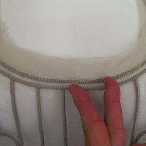 Faint discoloration on the neckline. See photos with hands. I treated it once. It may or may not come out with more treatment.