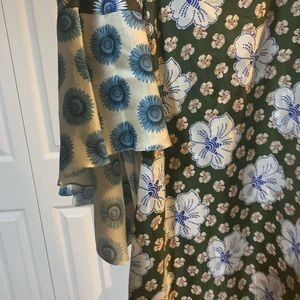 -Team it with a clutch and stiletto sandals for a special event. COLOUR: Blue COMPOSITION: 100% silk. CARE: Dry clean Lightweight silk twill Khaki-green, white and dark-green patchwork panels Multicoloured Hibiscus print Fluted waterfall sleeves Buttoned back