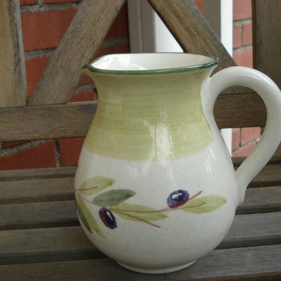 Nice porcelain/ceramic pitcher made in Italy with hand painted olives and olive leaves allover the pitcher. It can be used to serve water, juice or sangria.... Please contact me with any questions you might have!
