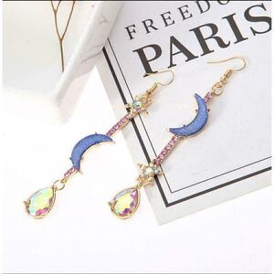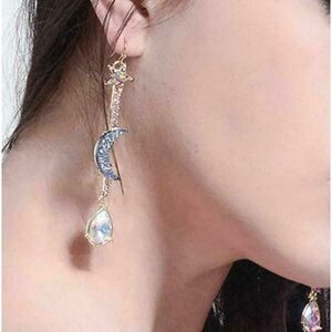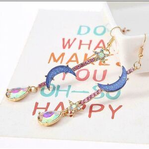 Beautiful Betsey dangle pierced earrings. She held the moon and stars and shines like no other. Gorgeous golden iridescent and sparkling earrings with a moon Star dangle design that begs for attention.