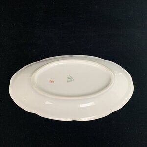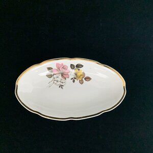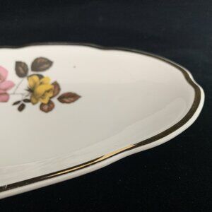 Vintage Mid Century BK Titov Veles porcelain oval serving bowl from Yugoslavia. Elegant floral design with gold trim detailing. Classic mid-century European craftsmanship, perfect for dining, display, or collection.