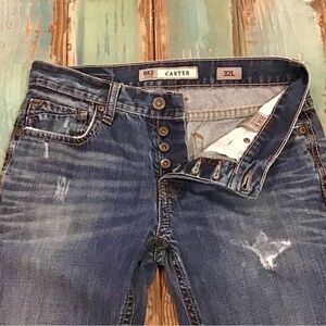 BKE 32L Carter Boot Cut Mens Jeans, Distressed, 32x32.5, Logo, Button Fly. Preowned. Overall distressed and wear at the hems. Non-stretch denim.