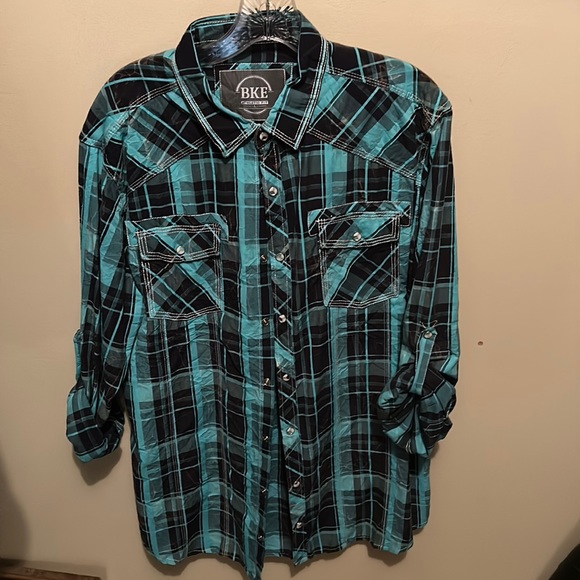 Athletic fit , pearl snap , large in size mint condition. Great for going out casual or a night on the town.