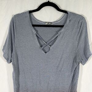 BKE Blouse Women's Small Blue Red Striped Vneck Short Sleeve Pullover