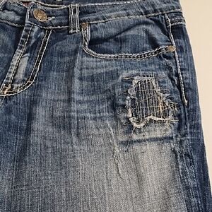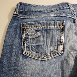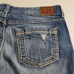 These BKE jeans showcase a chic crop length cut in a classic blue hue, perfect for a casual yet stylish look. The denim features a subtle distressed finish, adding a touch of character to your outfit. Unique decorative stitching on the back pockets enhances their fashionable appeal.